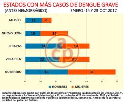 Los cinco estados de la República juntos suman 188 casos de Dengue Grave, antes Dengue Hemorrágico, que representan el 71.7 por ciento del total que es de 262 casos en todo el país en el periodo enero- 14 de octubre del año en curso.