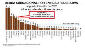 Al segundo trimestre de este año, Veracruz se mantenía como la quinta entidad federativa más endeudada del país con 44 mil 97.5 millones de pesos, monto muy por arriba del promedio subnacional de 18.6 mil millones de pesos, recién publicó el Centro de Estudios de las Finanzas Públicas (CEFP) de la Cámara de Diputados.