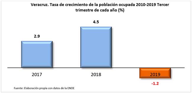 La población ocupada en Veracruz registra una caída de -1.2% en el tercer trimestre de 2019, comparada con el mismo mes del año anterior. Esta disminución en la ocupación, revierte la tendencia que se venía registrando en los dos años anteriores, durante los cuales la población ocupada creció 2.9% en 2017 y 4.5% en 2018.