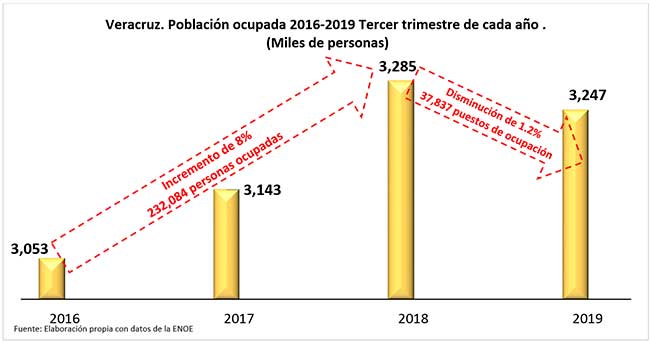 Esto significa que durante los tres primeros trimestres de 2019, se perdieron un total de 37,837 puestos de trabajo, ya que mientras en 2018 la población ocupada era de 3 millones 284 mil personas, para 2019 es de 3 millones 247 mil, lo que contrasta con lo sucedido durante el periodo 2016-2018 cuando la ocupación registró un incremento de 8%, lo cual representa aumento de 232,084 trabajadores.