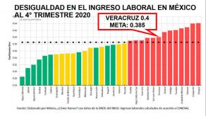 Al cuarto trimestre del año pasado, Veracruz se ubicó como el sexto de los 13 Estados de la República Mexicana con el mayor coeficiente de desigualdad en el ingreso laboral, 0.4, cuando la meta promedio nacional era de 0.385 de acuerdo con la organización “México, ¿cómo vamos?”.