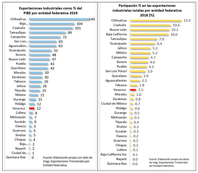 Para dimensionar con mayor precisión la importancia de las exportaciones en la generación de riqueza de cada estado, se calcula el valor de las ventas al exterior como porcentaje del Producto interno Bruto Estatal (PIBE) resultando que para Veracruz las exportaciones industriales equivalen al 12% de su PIBE. Un valor bastante bajo, que evidencia un escaso desarrollo del sector exportador y que ubica a Veracruz en el lugar 21º ente los estados de menor capacidad exportadora, muy lejos de otros que han obtenido grandes logros en materia de ventas al exterior, como es el caso de Chihuahua en donde las exportaciones industriales representan el 140% del PIBE, Baja California donde su valor es de 104% del PIBE, Coahuila de 101 y Tamaulipas de 84%. Estados con una gran diversificación de sus exportaciones, con gran componente de tecnología, que atraen grandes montos de inversión extranjera anualmente y que gracias a este desarrollo exportador alcanzan altas tasas de crecimiento económico.