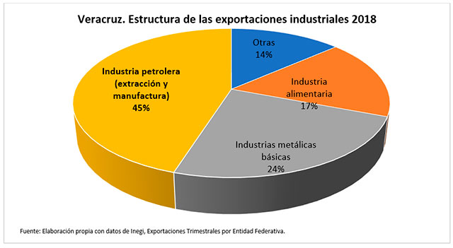 El comportamiento de las exportaciones veracruzanas está influido fundamentalmente por el desempeño de las exportaciones petroleras las cuales representan el 45% del total de las exportaciones del sector industrial.