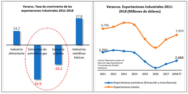 Por esta razón la caída de las exportaciones de la industria de extracción de petróleo en un 35.9% y de la industria petroquímica en un 20% que se registra de 2011 a 2018 es determinante para explicar la reducción de las exportaciones totales antes mencionada.