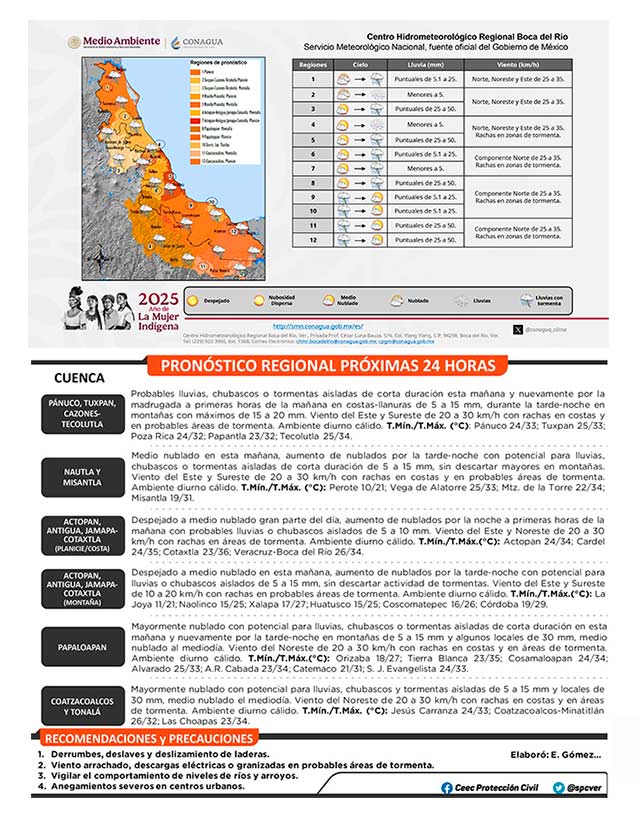 El pronóstico indica para esta jornada ambiente diurno cálido y bochornoso, el viento del sureste, este y noreste moderado en costas y probables lluvias, chubascos o tormentas aisladas de corta duración por la tarde-noche sobre regiones de montaña y zona sur, algunas por la noche a primeras horas de la mañana en zonas de costa, previendo que durante el fin de semana incremente ligeramente el potencial de lluvias-tormentas por la llegada de la onda tropical número 11 sobre y al sur de la región ístmica de Tehuantepec (actualmente con el eje cruzando Guatemala) y de su interacción con una vaguada en el suroeste del Golfo de México,.