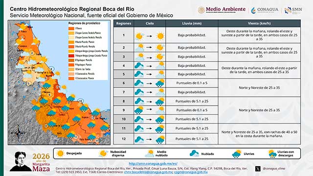 Esta mañana amanece con cielo despejado en el norte y nubosidad baja en el centro y sur de la entidad. Se espera que el viento cambie de dirección al este y sureste con rachas frescas. El ambiente diurno podría ser más elevado que en días pasados, pero dominando un ambiente fresco a frío por la noche y madrugada.