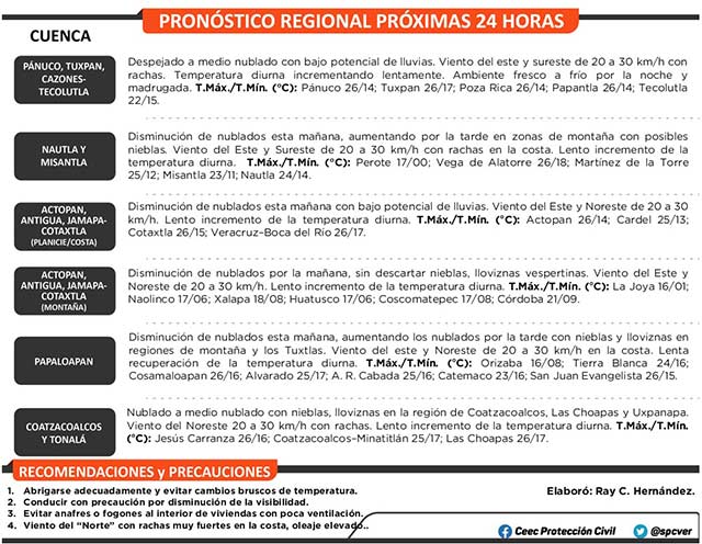 Esta mañana se observa cielo despejado en el norte de la entidad y nubosidad baja en el centro y sur, pero la tendencia se prevé que sea a disminuir gradualmente en el transcurso del día y posiblemente un fin de semana más estable con cielo despejado y recuperación de la temperatura diurna. No obstante, es posible que por las tardes se presenten áreas de niebla en zonas de montaña y aún dominando el ambiente fresco a frío.