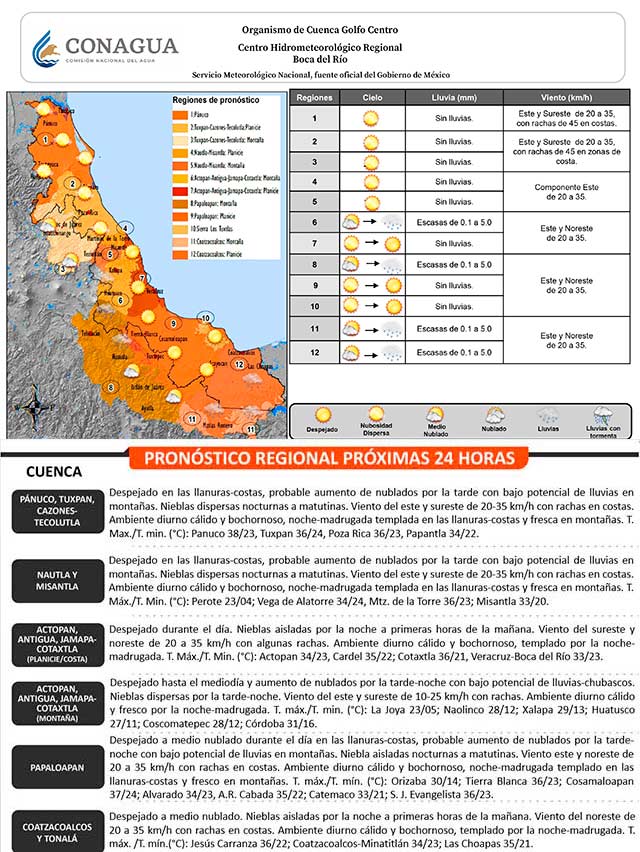 El pronóstico nuevamente indica condiciones de tiempo estable a partir de esta jornada y durante este fin de semana con escasa nubosidad, viento del Sureste, Este y Noreste moderado a fresco en costas y ambiente diurno caluroso. El potencial de lluvias muy limitado en las llanuras-costas y bajo potencial de lluvias sobre regiones de montaña donde no se descarta el desarrollo de nublados con algunas lluvias dispersas y de corta duración, especialmente en colindancias con Estados vecinos.