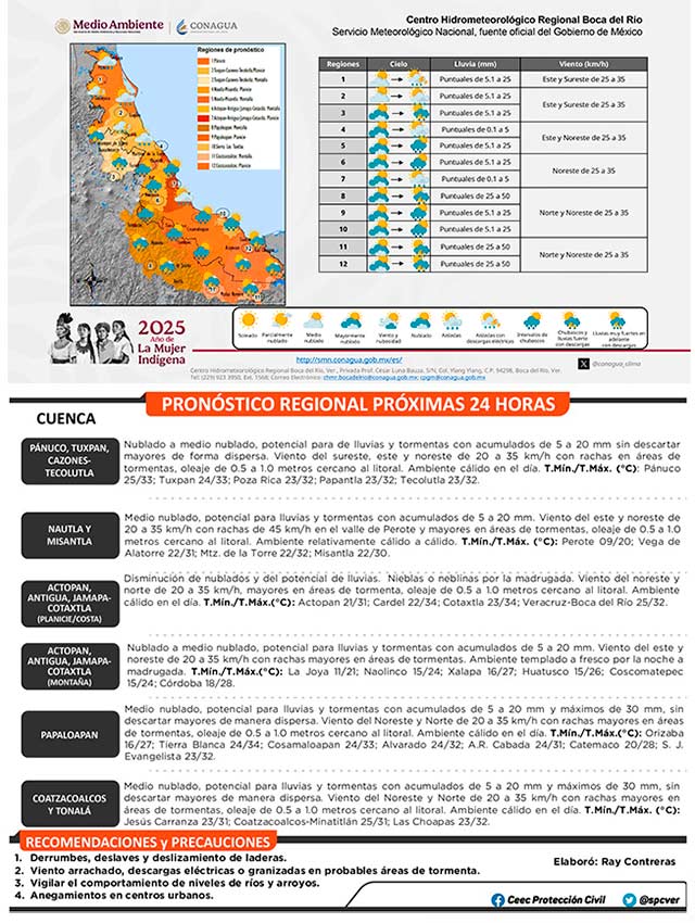 Durante este periodo una vaguada en superficie con eje sobre el suroeste del Golfo de México, en interacción con el paso de la onda tropical número 18 desplazando su eje sobre y al sur de Oaxaca aportan humedad sobre el oriente del territorio nacional para favorecer nubosidad con potencial para lluvias y tormentas, con acumulados de 5 a 20 milímetros y máximos de 30 milímetros, sin descartar mayores. Por otra parte, el ambiente será cálido en planicies y costas, mientras que relativamente cálido en montañas. Viento dominante del sureste, este y noreste, de 20 a 35 kilómetros por hora en costas, con rachas en áreas de tormenta.