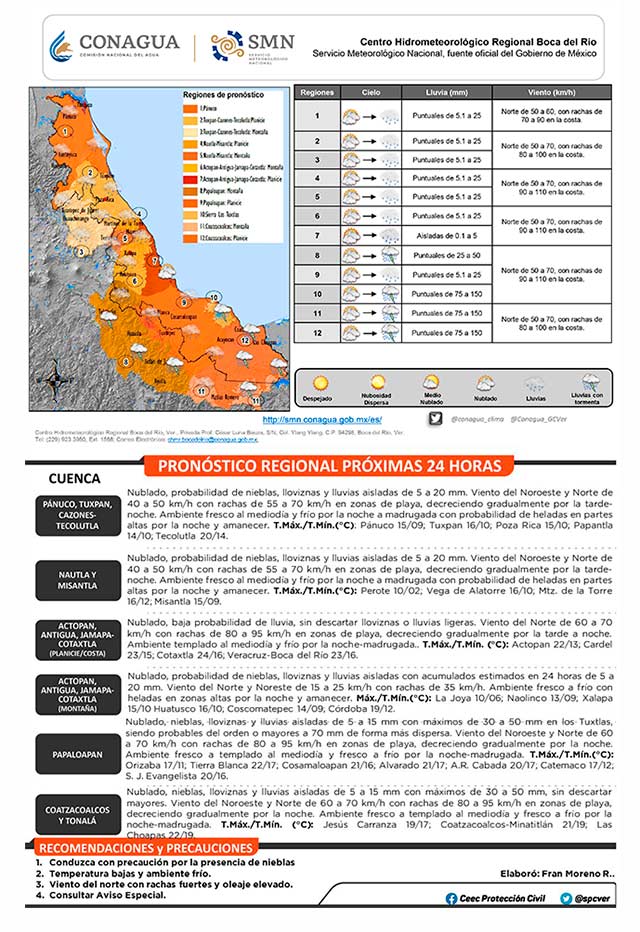 Condiciones para nieblas, neblinas y lloviznas, así como lluvias ligeras, esperando los máximos acumulados en la región de Los Tuxtlas y sur de la entidad, donde se podrían alcanzar acumulados de 50 a 70 kilómetros por hora. Ambiente fresco a frío durante el día, frío por la noche a madrugada con posibles heladas al amanecer en partes altas.