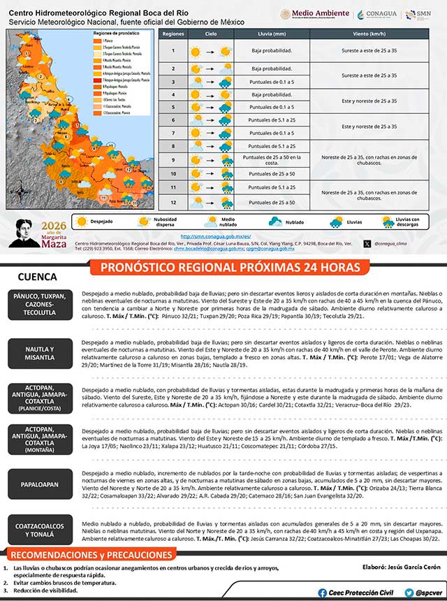 Viernes con probabilidad de lluvias y tormentas aisladas, con los mayores acumulados en cuencas del sur del estado. Ambiente diurno caluroso; noche a madrugada fresca a fría. El viento dominante será del sureste, este y noreste, fijándose al norte y noreste durante la madrugada del sábado.