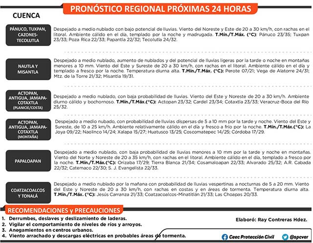El viento será del este y sureste, con rachas de 35 kilómetros por hora. Las temperaturas diurnas presentarán valores altos en especial en llanuras y costas, pero el ambiente será fresco por la noche y madrugada. Estas condiciones se extenderán a las siguientes 24 horas, con tendencia a incrementar nuevamente el potencial para eventos dispersos el domingo.