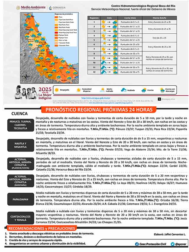 Se localiza una vaguada en el suroeste del Golfo de México y, en el Pacífico, la onda tropical número 29 al sur de las costas de Guerrero. En Veracruz se prevé tiempo despejado en el norte y centro, y medio nublado en cuencas del sur, con desarrollo de nublados con probabilidad de lluvias y tormentas dispersas de 5 a 20 milímetros y máximos de 30 a 50 milímetros, especialmente vespertinas y nocturnas en el litoral, y matutinas en el litoral. Las temperaturas diurnas serán altas y el ambiente bochornoso en zonas bajas, pero el ambiente será templado a fresco por la noche. Durante el fin de semana, se prevé un incremento del potencial de lluvias en cuencas del sur y centro, extendiéndose al norte. Consulten el Aviso Especial.