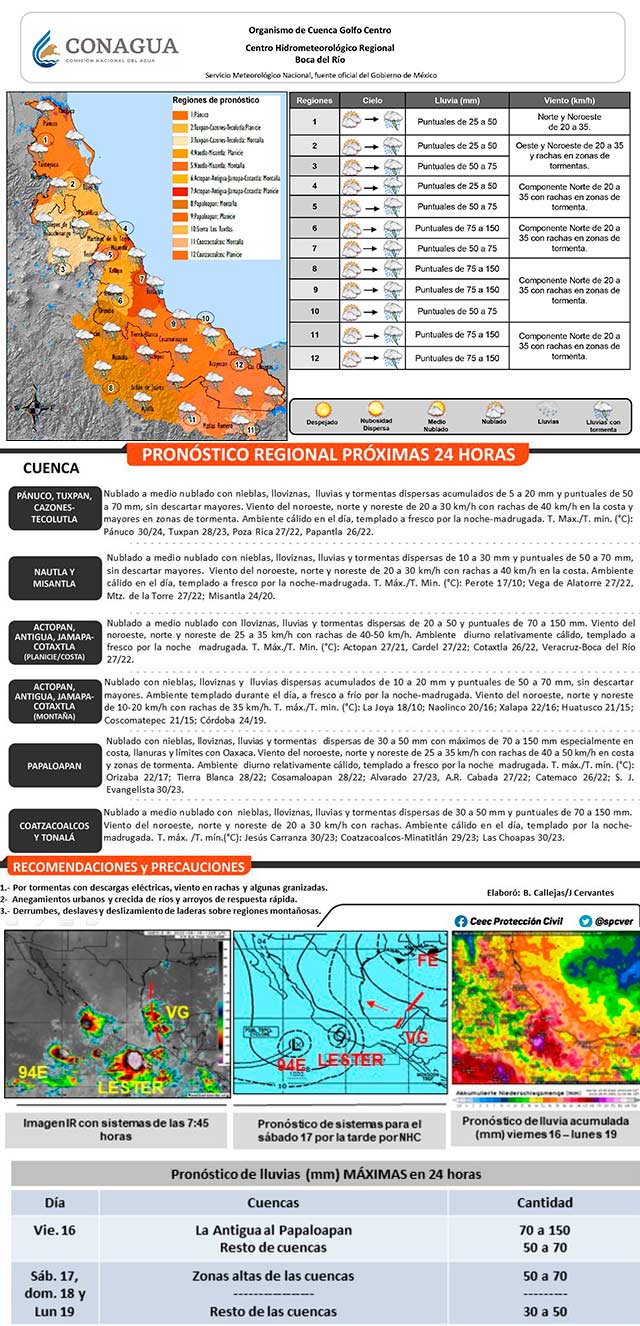 En Veracruz dominará un viernes nublado con nieblas, lloviznas, lluvias y tormentas dispersas, significativas sobre las cuencas del Actopan, Antigua, Jamapa-Cotaxtla, Papaloapan, Coatzacoalcos y Tonalá, además se han extendido a cuencas del norte, valores acumulados de 20 a 50 milímetros y puntuales de 70 a 150 milímetros. En la costa, viento del Noroeste, Norte y Noreste de 25 a 35 kilómetros por hora y rachas de 40 a 50 kilómetros por hora. la temperatura disminuirá ligeramente, ambiente templado en llanura y costa, fresco a frío en montaña. El sistema meteorológico que genera dichas condiciones es la vaguada en superficie en el Oeste-Suroeste del Golfo de México y un campo de viento divergente en altura. Además, el pronóstico indica que estos sistemas continuarán en las siguientes 24 horas, lo que extenderá las condiciones para precipitaciones al sábado en Veracruz.