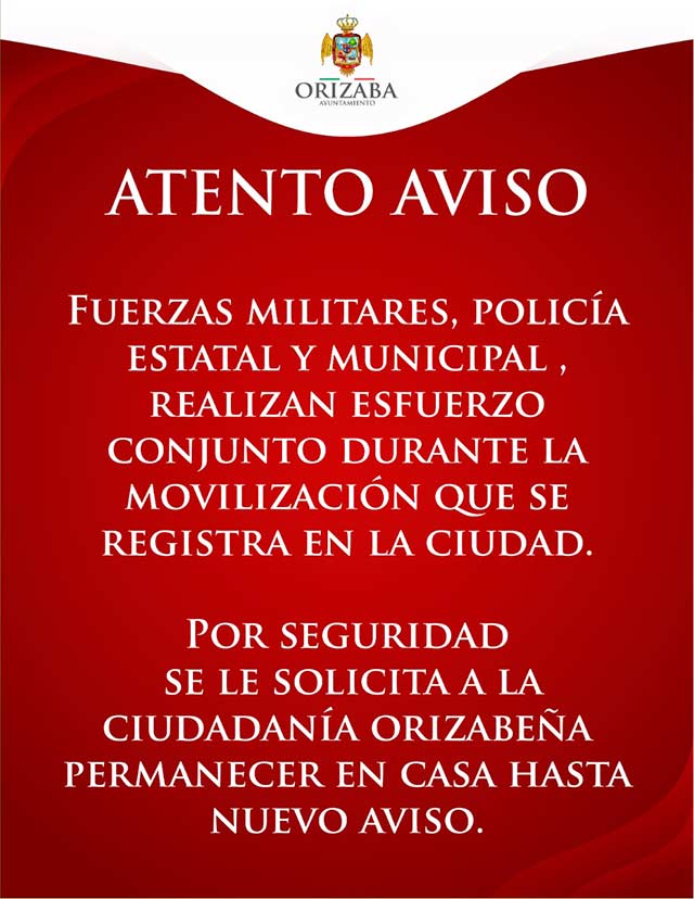 “Fuerzas militares, policías estatal y municipal realizan esfuerzo conjunto durante la movilizació que se registra en la ciudad. Por seguridad se le solicita a la ciudadanía orizabeña permanecer en casa hasta nuevo aviso”, difundió el Ayuntamiento.