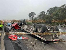 Un tráiler cargado de estructuras metálicas que circulaba en la autopista Perote-Xalapa, volcó por una presunta una falla en el sistema de frenos, dejando como saldo 2 personas muertas dentro de la cabina del tractocamión.