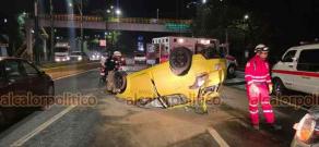 Un automóvil particular volcó la noche de este lunes en la carretera federal Xalapa-Veracruz, a la altura de Plaza Ánimas y en el carril con dirección a Las Trancas, luego de que su conductor perdiera el control de la unidad tras impactarse contra un talud de tierra.