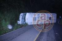 El chofer, que venía acompañado de su esposa y un joven que venía de “rait” a trabajar a Córdoba, ante su desesperación, decidió rebotar el autobús en un cerro, lo que provocó la volcadura saliéndose el eje delantero y terminar acostado el autobús a media carretera.