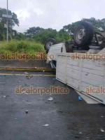 A la altura del fraccionamiento Geo Los Pinos Uno, sobre la autopista Cardel a Veracruz, ocurrió la volcadura de una camioneta, cargada con garrafones de agua purificada, dejando al conductor con lesiones leves.