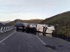 Cierre total de la circulación vehicular en la autopista 150-D, Puebla-Orizaba, ocasionó la madrugada de este domingo el conductor de un tractocamión acoplado a doble contenedor tipo auto tanque, cuya carga de combustóleo se derramó en la carpeta de rodamiento.