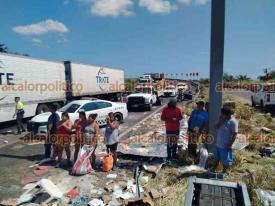 En carreta, el tráiler impactó un automóvil color vino, marca Volkswagen Vento. Por el impacto, la mercancía, varias toneladas de abarrotes, terminó regada en la carretera al abrirse el contenedor del tráiler. Fue entonces que personas que viven en los alrededores y algunos automovilistas comenzaron a hurtar la carga de abarrotes.