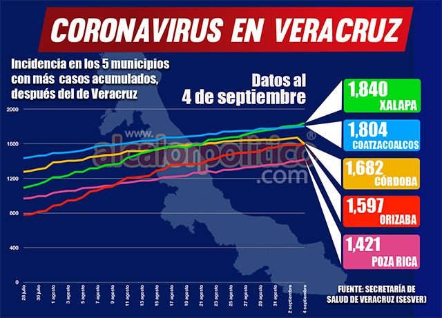En el municipio de Veracruz, los contagios de COVID-19 suman 6,504 hasta este viernes 4 de septiembre (con gráfica aparte), aquí se muestra que en segundo lugar se agrava Xalapa con 1,840 casos activos, superando con 36 a Coatzacoalcos que por meses estuvo en esa posición y el otro contraste se da en Córdoba, que ha bajado su ritmo de contagios y en cambio, Orizaba casi lo alcanza pues sólo está a 85 casos de distancia. Las líneas muestran lo distinto que era el 28 de julio.