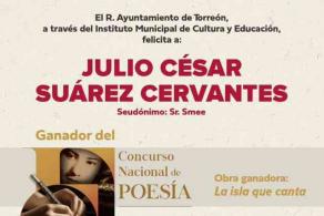 El trabajo poético del xalapeño Julio César Suárez Cervantes, conocido en los círculos literarios como Julio María, fue elegido como ganador entre 215 trabajos participantes al Concurso Nacional de Poesía “Enriqueta Ochoa”, organizado por el Ayuntamiento de Torreón, que le otorgó, además del premio económico, la publicación de su poemario.